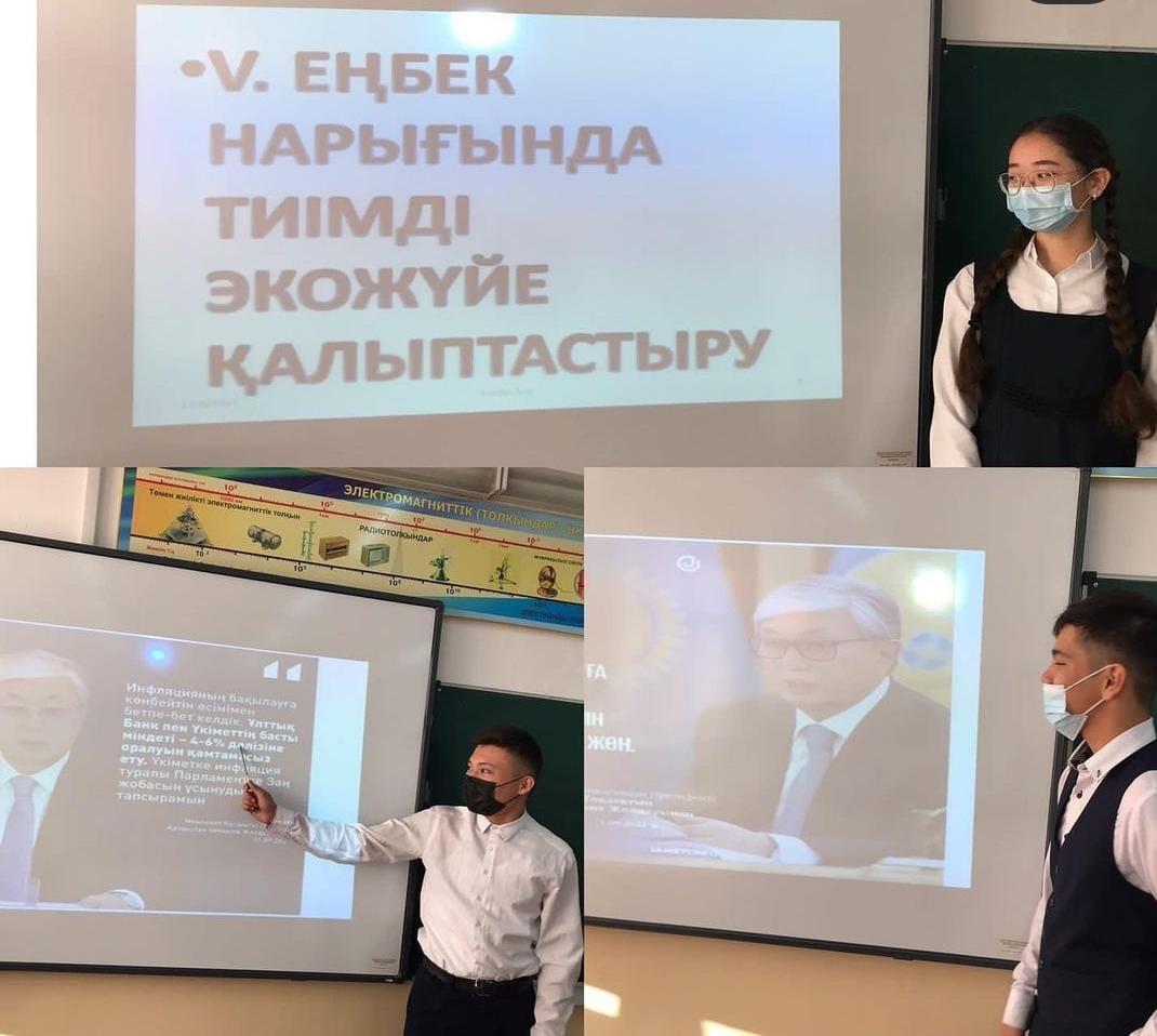 Сабақ барысында оқушылар жолдаудың басым бағыттарын талдап, өз көзқарастарын білдірді. Тәуелсіздігіміздің 30 жылдығында жеткен жетістіктерімізге көз жүгірте отырып, Еліміздің ертеңі үшін сапалы білім алудың маңыздылығын жете түсінді.
