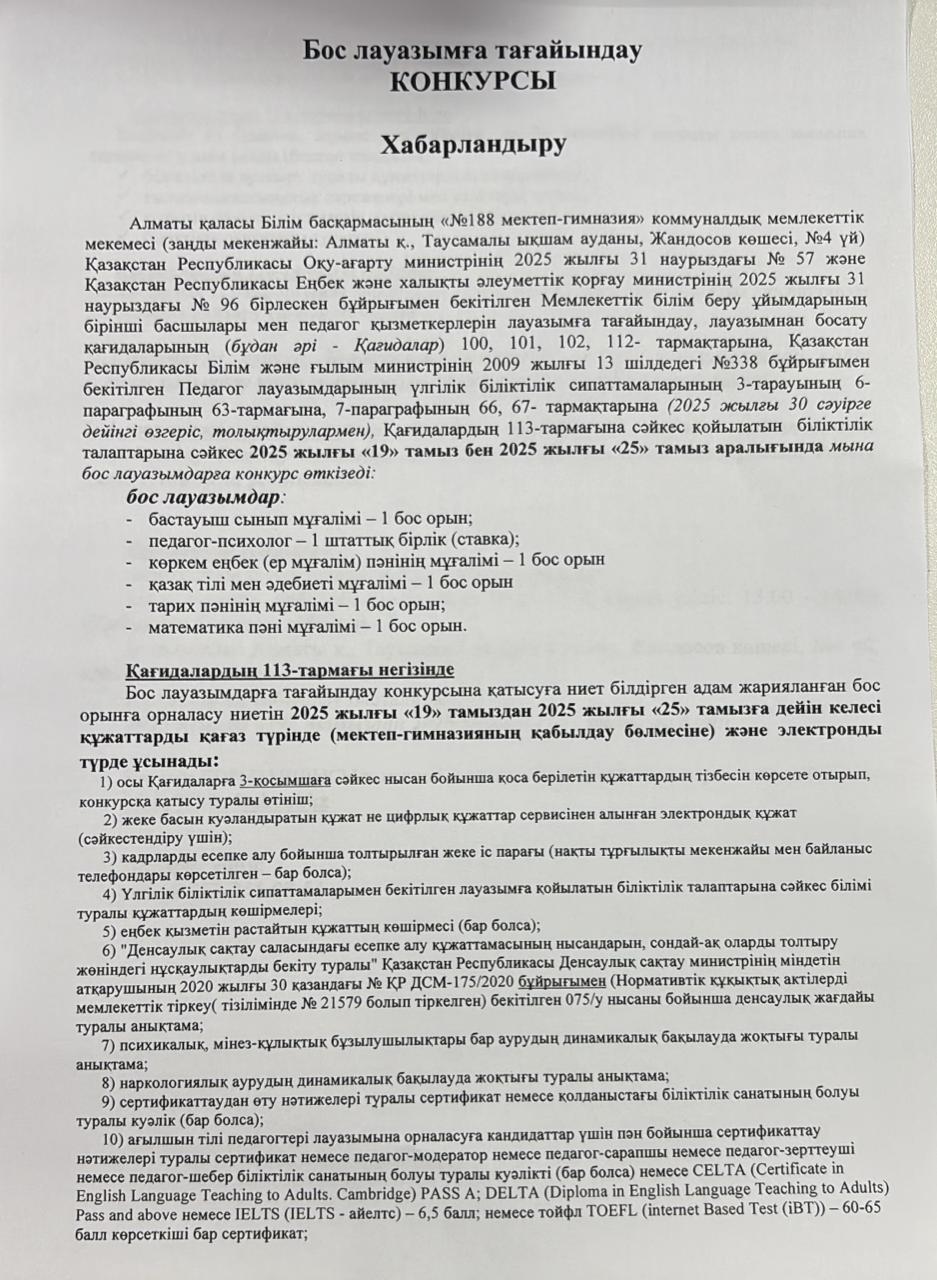 Бос лауазымға тағайындау конкурсы Хабарландыру