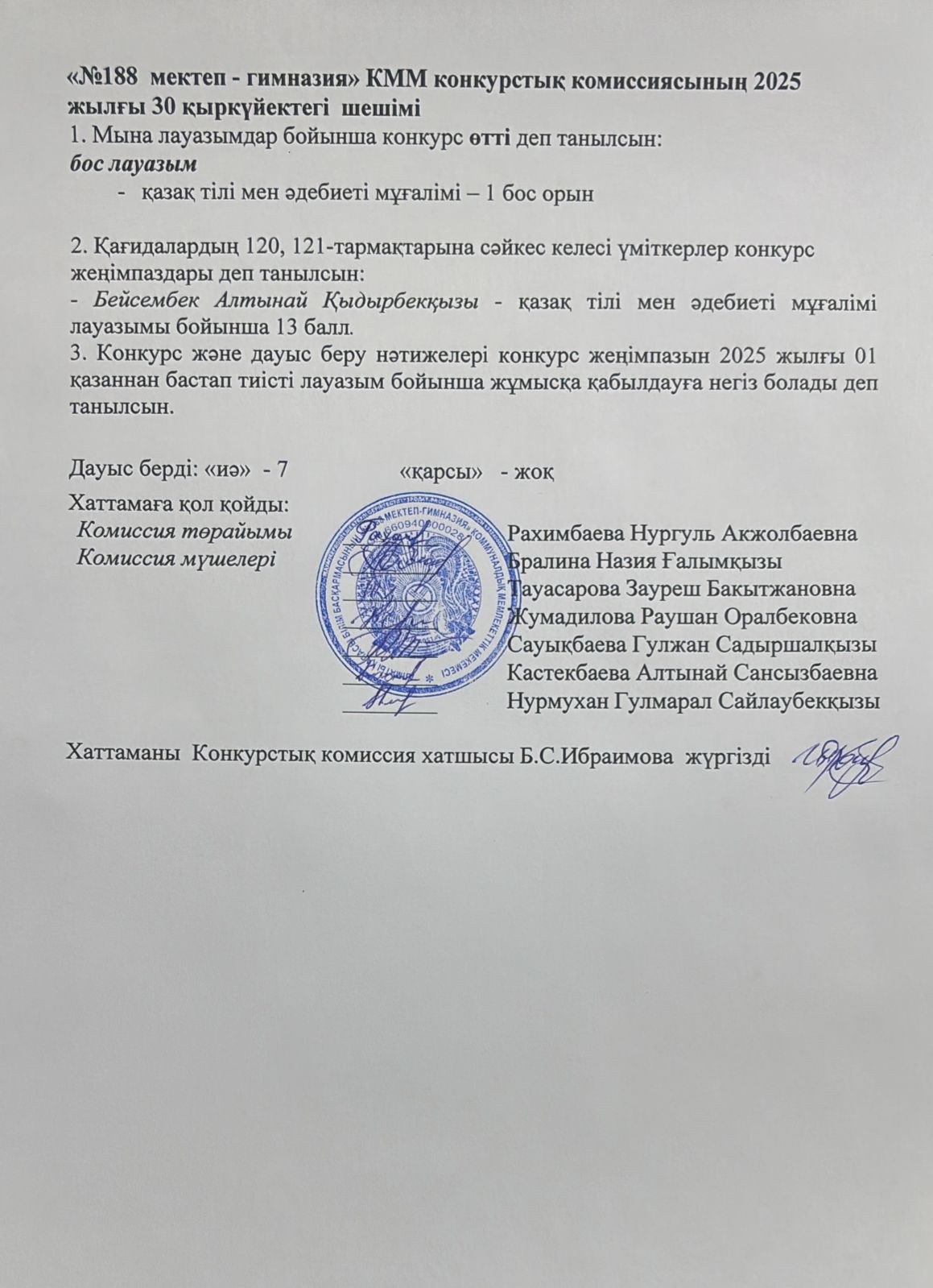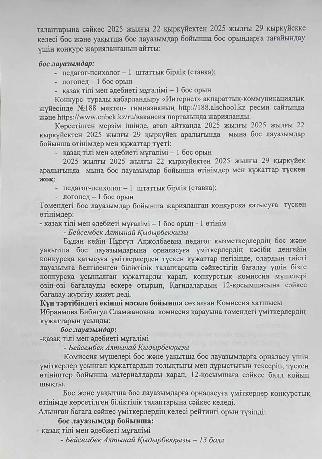 » » Бос лауазымдар бойынша жарияланған конкурсының қорытынды №4 хаттамасы