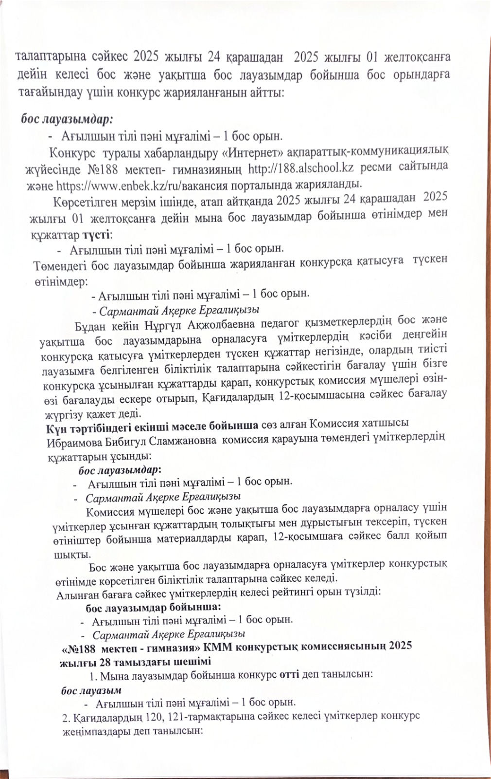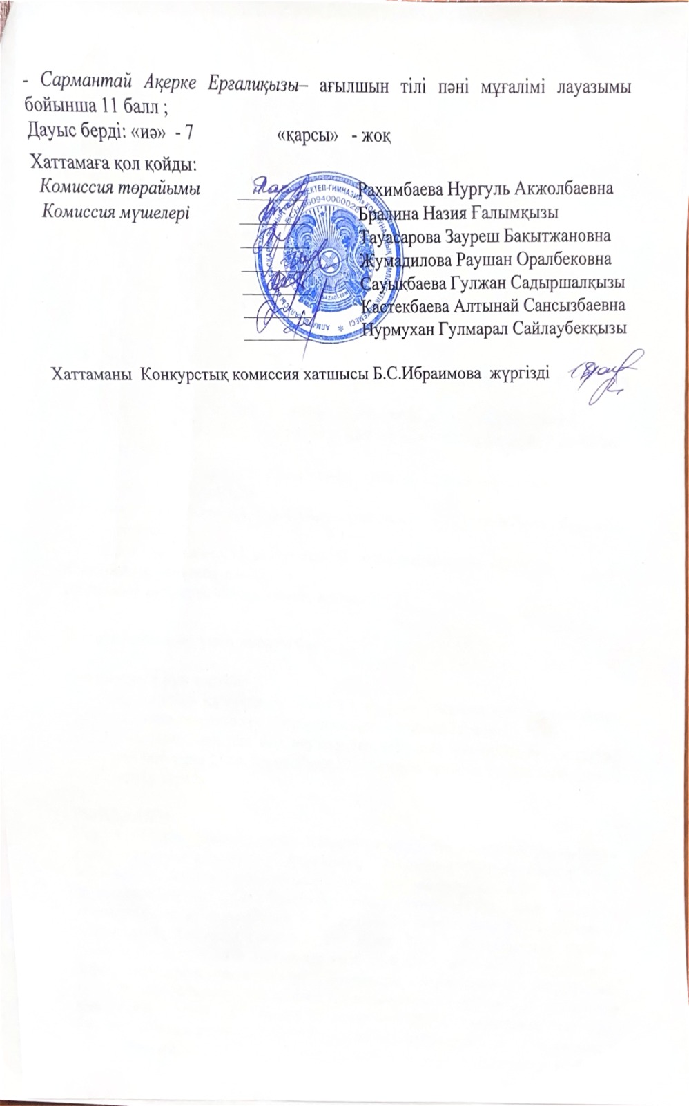 » » Бос лауазымдар бойынша жарияланған конкурсының қорытынды №7 хаттамасы