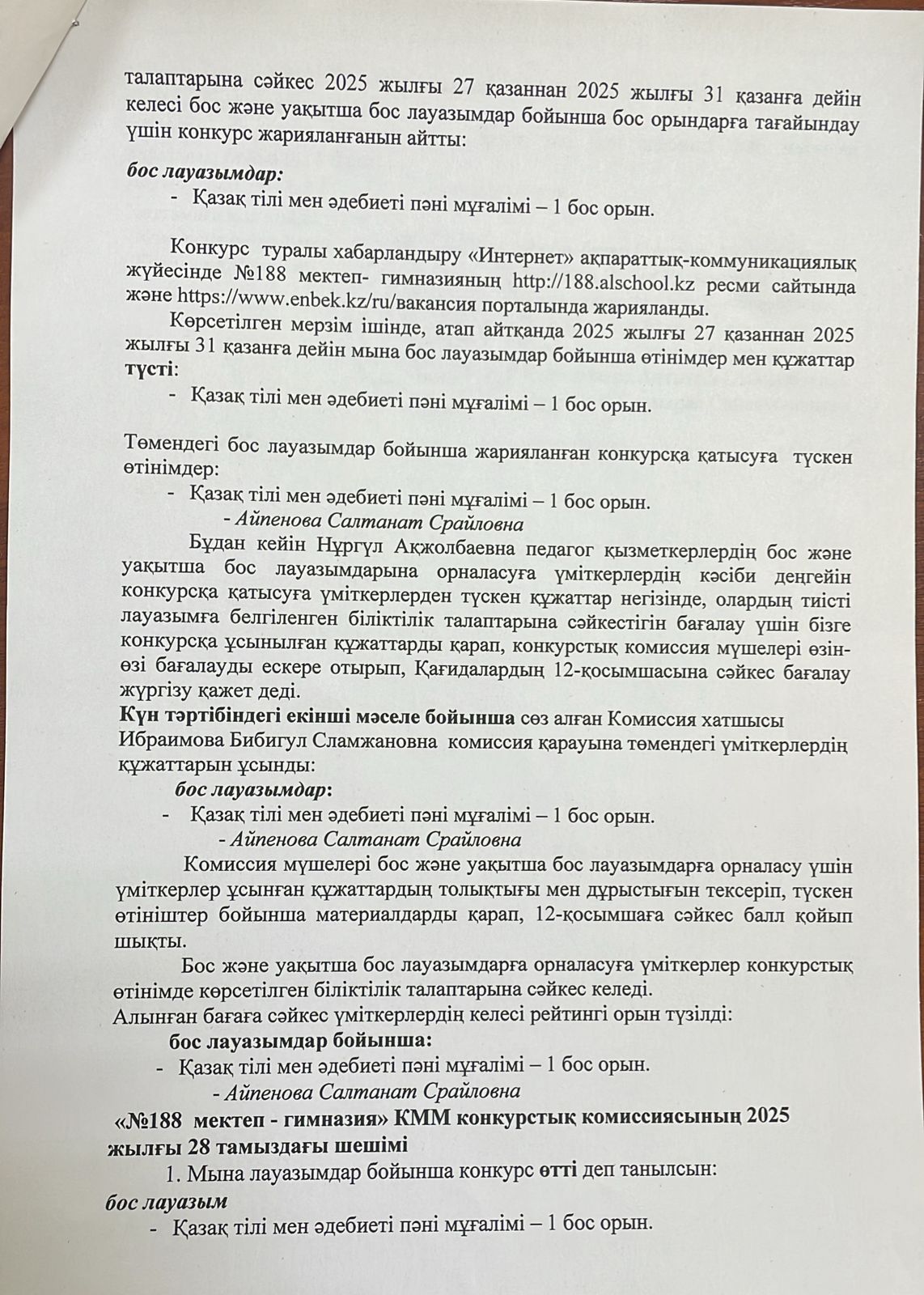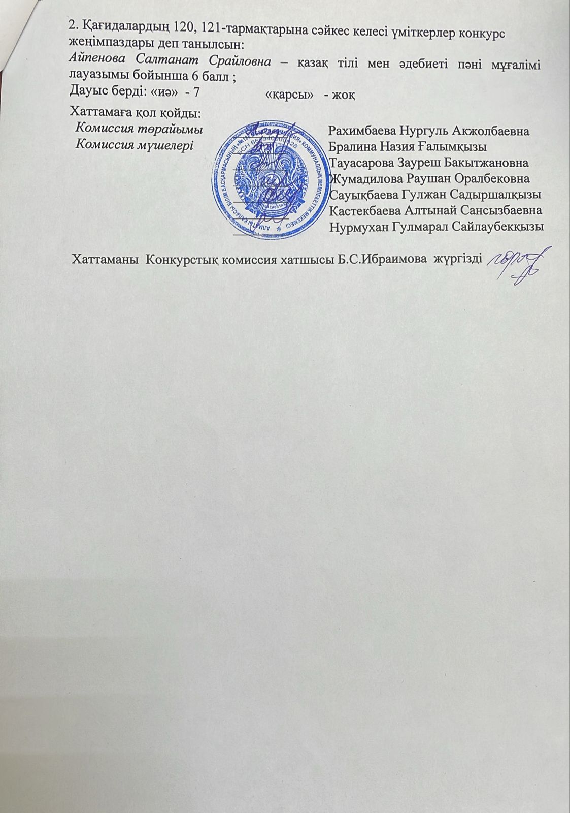 Конкурстық комиссия отырысының №5 хаттамасы
