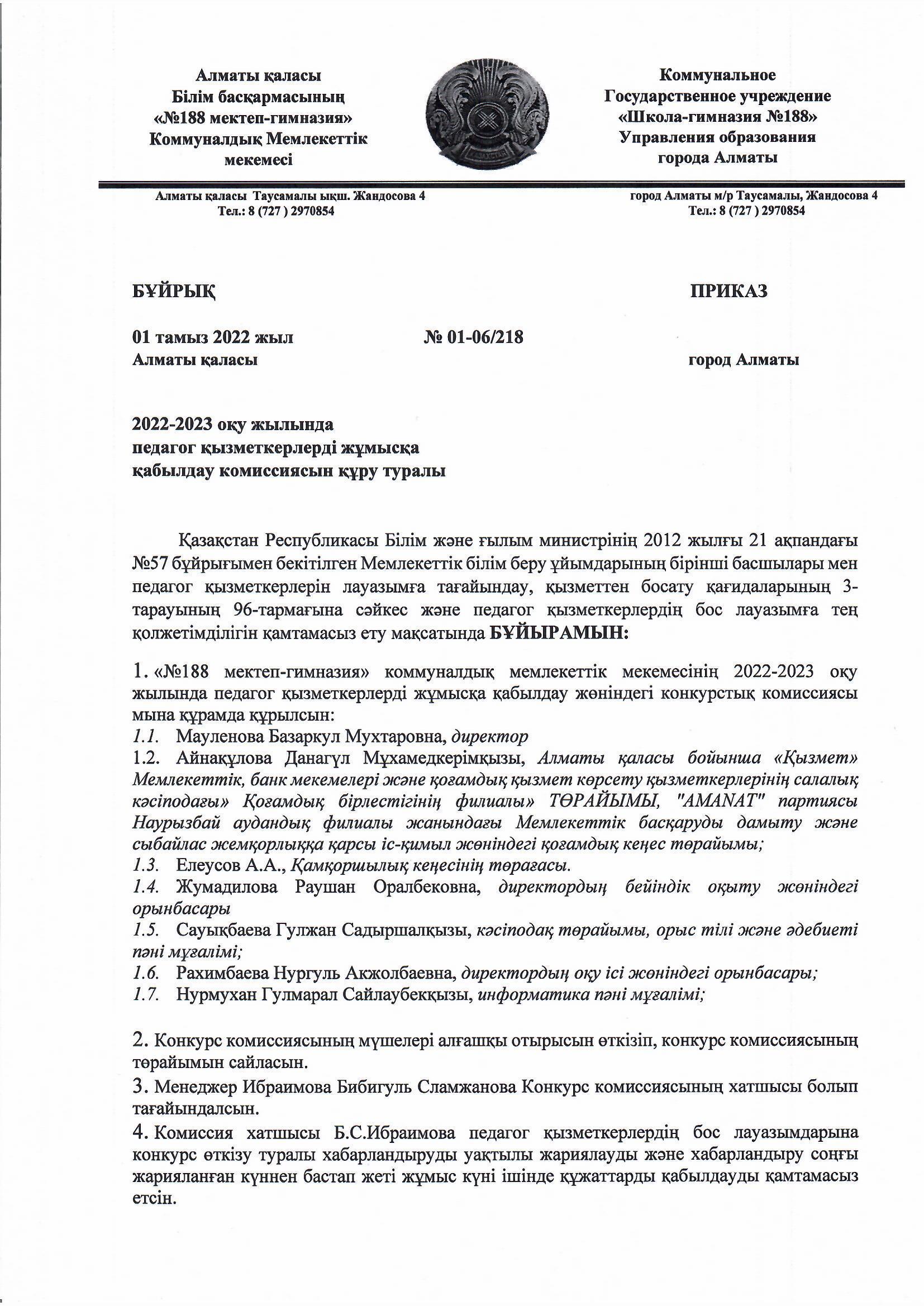 » » Педагог қызметкерлерді жұмысқа қабылдау комиссиясын құру 2022-2023 оқу жылы