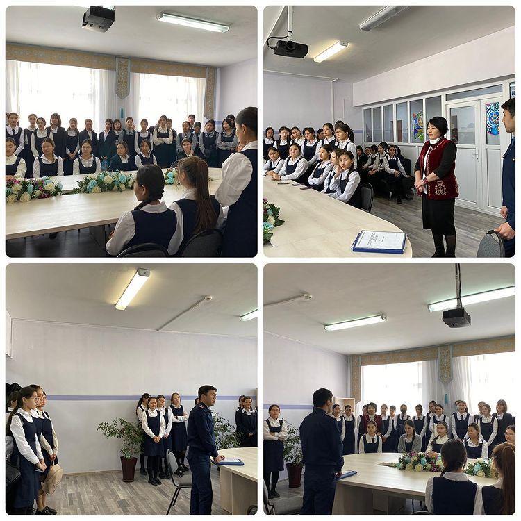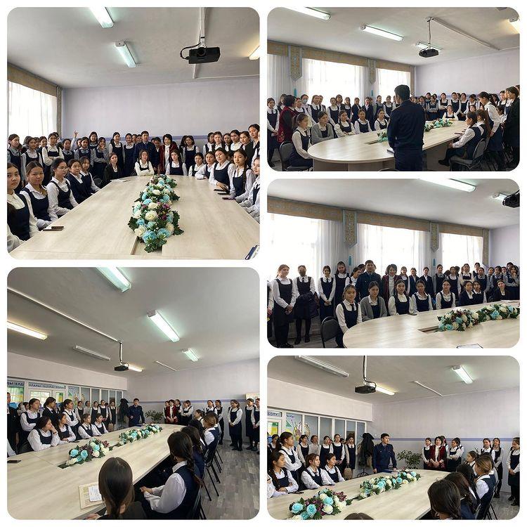 «Жасөспірімдер арасындағы құқықбұзушылықтың алдын алу» тақырыбында 9-10-11 сынып қыздарымен Алматы қаласы, Наурызбай ауданының ЖҚПБ ЮПБ инспекторы полиция аға лейтенанты Қаби Абылай Ғалымұлы әңгіме жүргізді.