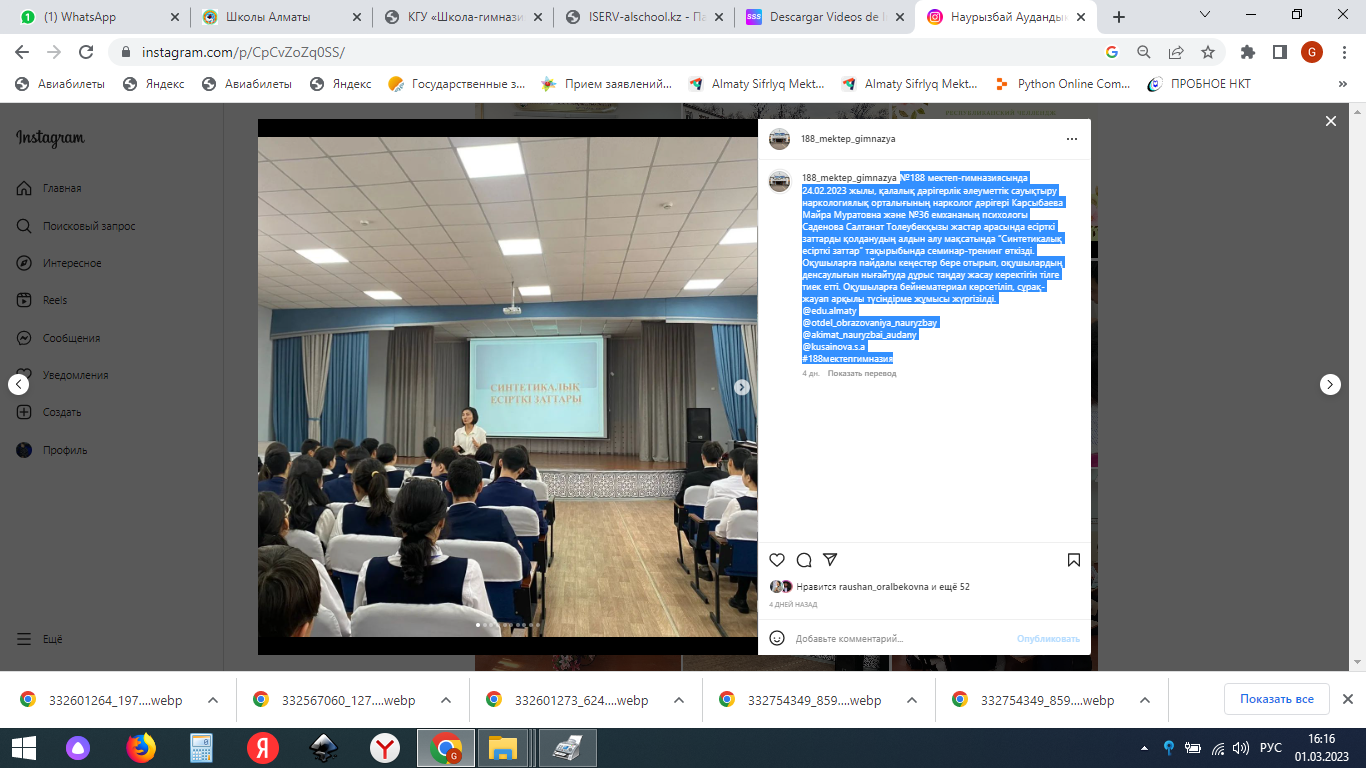 №188 мектеп-гимназиясында 24.02.2023 жылы, қалалық дәрігерлік әлеуметтік сауықтыру наркологиялық орталығының нарколог дәрігері Карсыбаева Майра Муратовна және №36 емхананың психологы Саденова Салтанат Толеубекқызы жастар арасында есірткі заттарды қолданудың алдын алу мақсатында “Синтетикалық есірткі заттар” тақырыбында семинар-тренинг өткізді. Оқушыларға пайдалы кеңестер бере отырып, оқушылардың денсаулығын нығайтуда дұрыс таңдау жасау керектігін тілге тиек етті. Оқушыларға бейнематериал көрсетіліп, сұрақ- жауап арқылы түсіндірме жұмысы жүргізілді.@edu.almaty