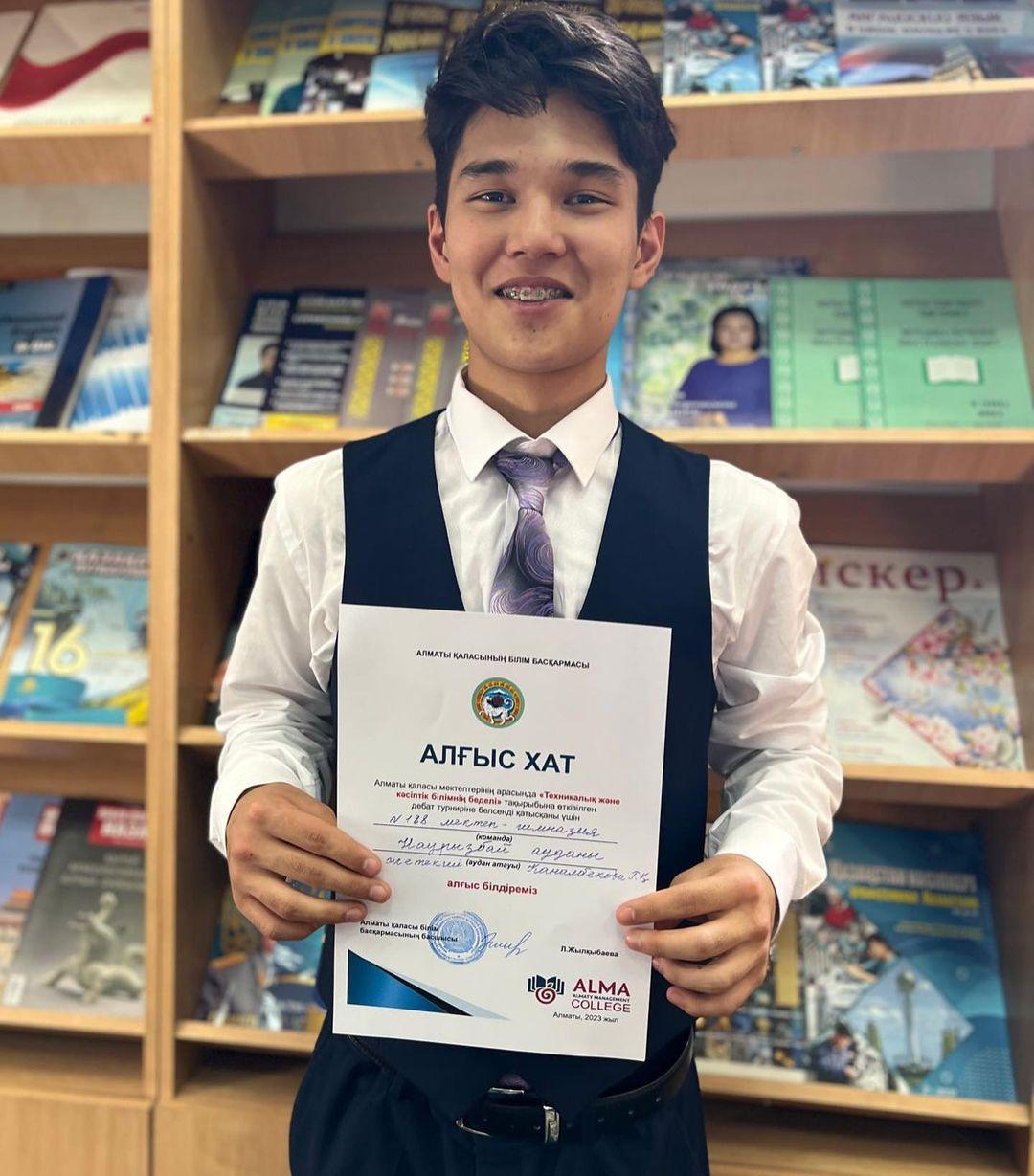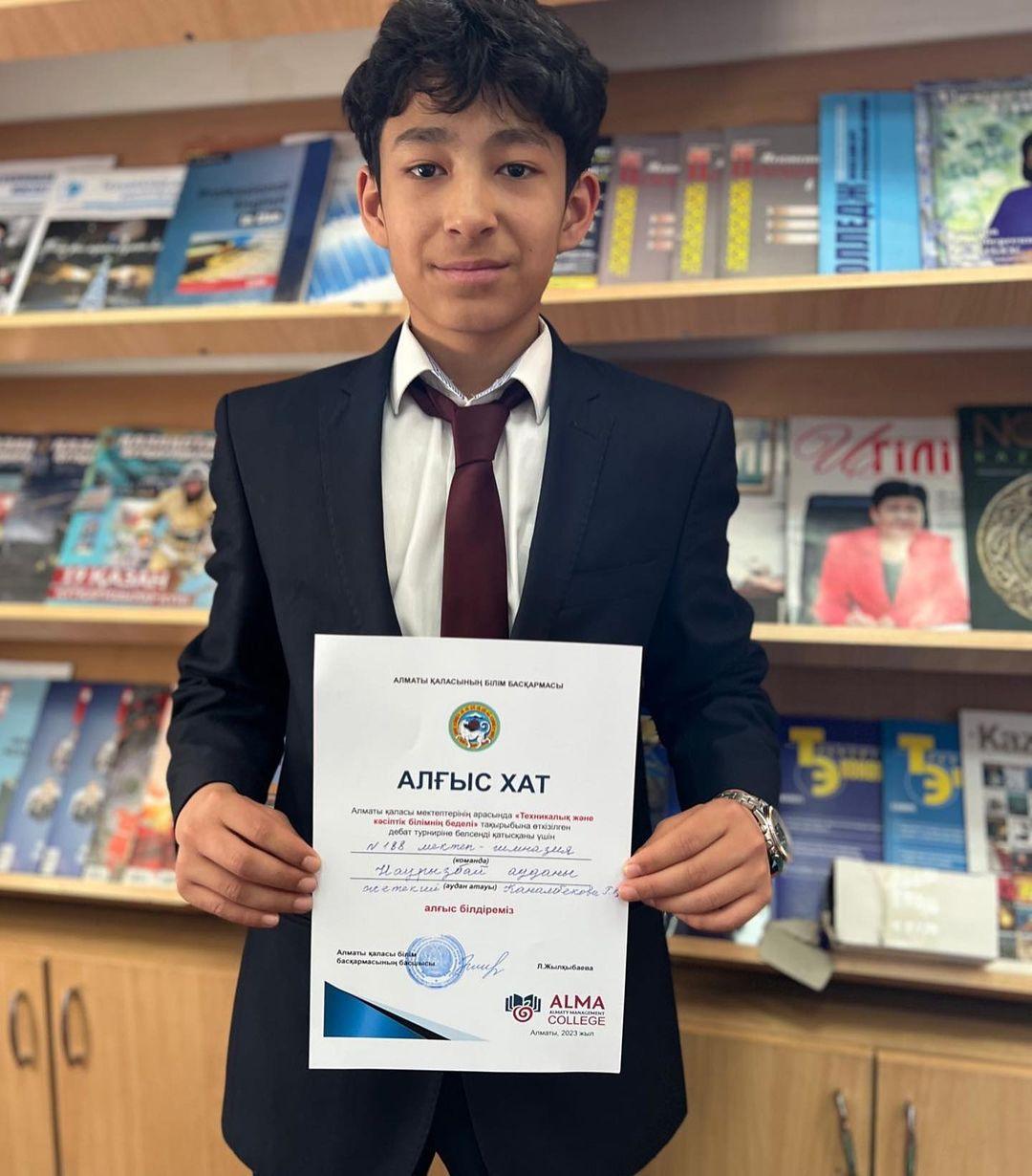 2023 жылдың 28 наурыз күні Алматы қаласы мектептері арасында “Техникалық және кәсіптік білім алу беделді ме?” тақырыбында, Халықаралық Бизнес Академиясы колледжінде қалалық пікірсайыс турнирі болып өтті.Мақсаты: оқушылардың сыни ойлауы мен шығармашылық белсенділігін арттыру, Қазақстан Республикасының жастарының адамгершілік және патриоттық тәрбиесін дамыту. Наурызбай ауданынан қазақ лигасы бойынша мектебімізден “Руханият” дебат клубының мүшелері Сағатбек Әділ, Ыбрайымхан Қарақат, Нұрзатұлы Нұрдиас пікірсайыста өз ойларын ортаға салып, алғыс хатпен марапатталды.@edu.almaty@otdel_obrazovaniya_nauryzbay