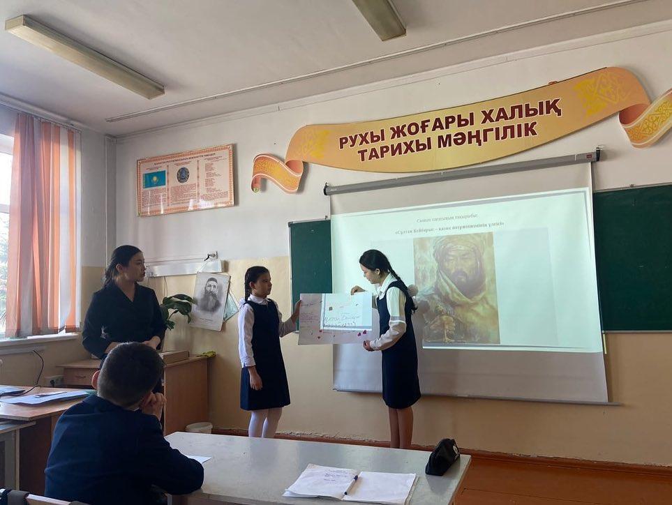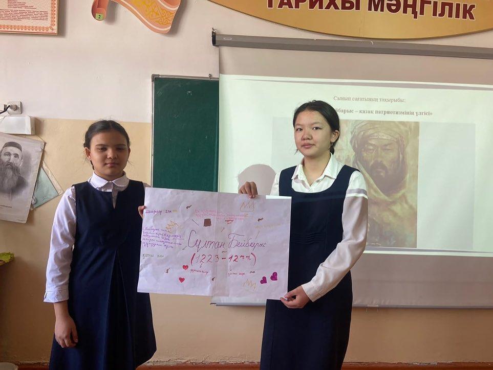 Қыпшақтың беріш руынан шығып, моңғол шапқыншылығы кезінде тұтқынға түсіп, мамлюктен(ақ құл) Мысыр елінің сұлтанына дейін көтерілген Сұлтан Бейбарыстың туғанына биыл 800 жыл. Соған орай 6 "Б" сыныбында "Сұлтан Бейбарыс - қазақ патриотизмінің үлгісі" атты тәрбие сағаты өтілді. Мақсаты: Өзге елдің сұлтаны болса да, өз еліңнің ұлтаны болу арманы болған Бейбарыс сұлтанның туған жеріне деген шексіз махаббатын үлгі етіп көрсету.Сынып жетекшісі: Тәңірберген Ж.