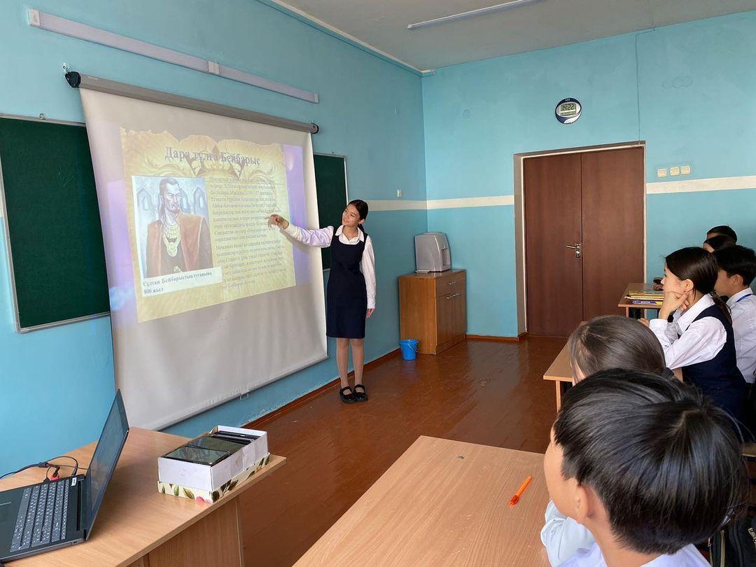 7”г” сыныбында "Сұлтан Бейбарыс- 800 жыл" тақырыбында тұлғатану сынып сағаты өтті.Мақсаты:оқушыларды Сұлтан Бейбарыстың өмірдерегімен таныстыру арқылы тарихи тұлғаларымызға деген қызығушылығын арттыру. Сұлтан Бейбарыстың өмірі туралы бейнефильм көрсетіліп, оқушылар жан- жақты деректермен танысты. Сұлтан Бейбарыстың құлдықтан әмірлікке дейінгі көтерілген қажырлы еңбегін, мақсат жолындағы табандылығы оқушыларға үлгі етілді.