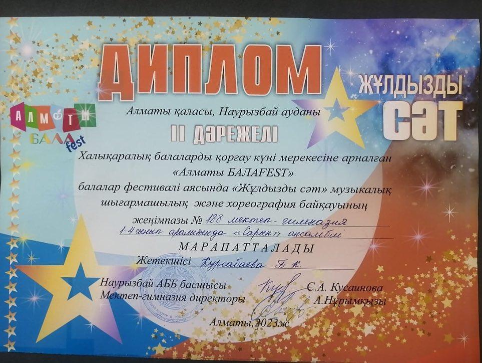 Алматы қаласы, Наурызбай ауданы Халықаралық балаларды қорғау күні мерекесіне арналған "Алматы БАЛАFEST" балалар фестивалі аясында "Жұлдызды сәт" музыкалық шығармашылық және хореография байқауының жеңімпазы #188 мектеп-гимназияның “Сарын”ансамблі жүлделі ІІ дәрежелі дипломмен және де “вокалдық өнер” номинациясы бойынша Алатау Алинұр III дәрежелі дипломмен Жұмағали Кербезсұлу белсене қатысқаны үшін марапатталды.