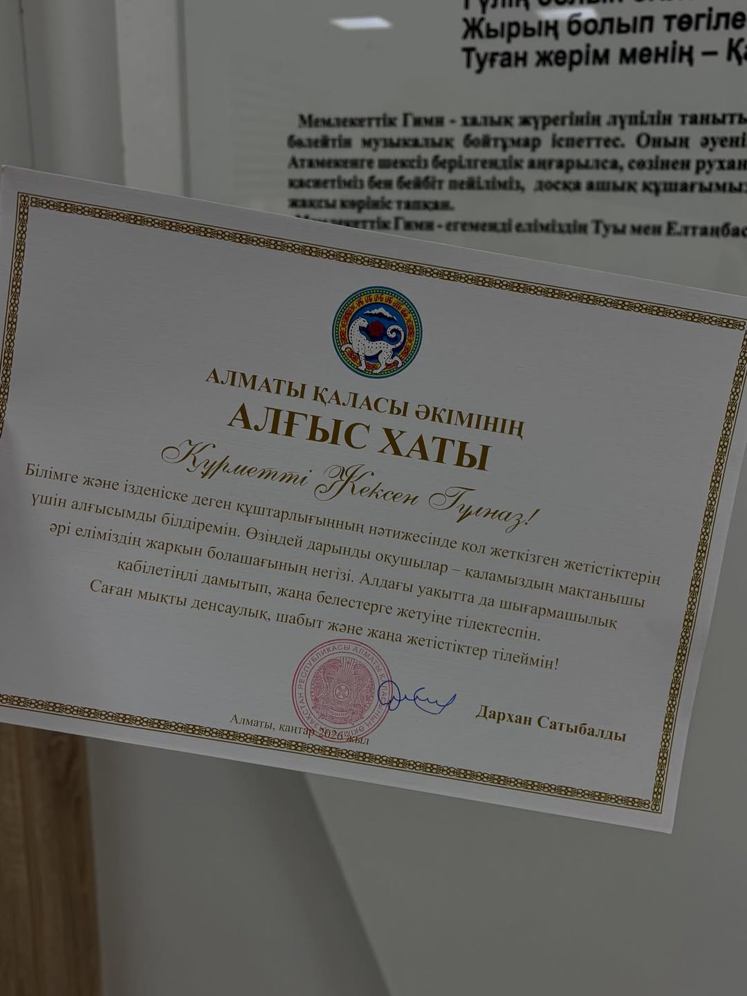 «Дарынды ұрпақ – ел болашағы» атты тағылымды жиын аясында Алматы қаласы, Наурызбай ауданы №188 мектеп-гимназиясының 11 «В» сынып оқушысы Жексен Гулназ Алматы қаласы әкімі Дархан Сатыбалдының Алғыс хатымен және 300 000 теңге көлеміндегі сертификатпен