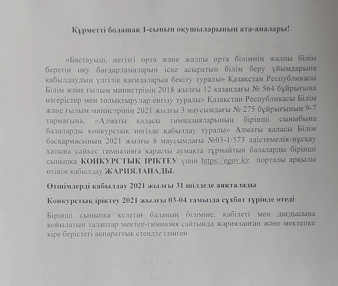 » » 1 СЫНЫПҚА ҚАБЫЛДАУ ТУРАЛЫ ХАБАРЛАНДЫРУ