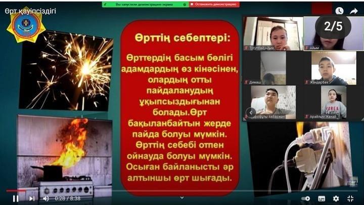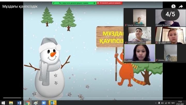 27.01 күні 6Д сынып оқушыларымен "Мұздағы қауіпсіздік", "Өрт қауіпсіздігі" ережелерін түсіндіру мақсатында сынып сағаты өткізілді. Мақсаты: балалардың қыс мезгілінде үйде, көшеде, табиғатта қауіпсіздік ережесін сақтай білу жөніндегі білімдерін бекіту; өрт қауіпсіздігі ережелері туралы білімдерін қалыптастырып, қауіп төнген кезде өздерін қорғай білуге машықтандыру болып табылады.