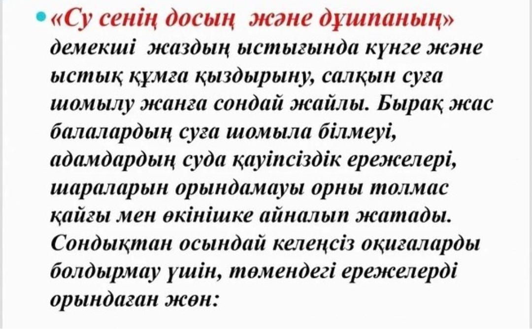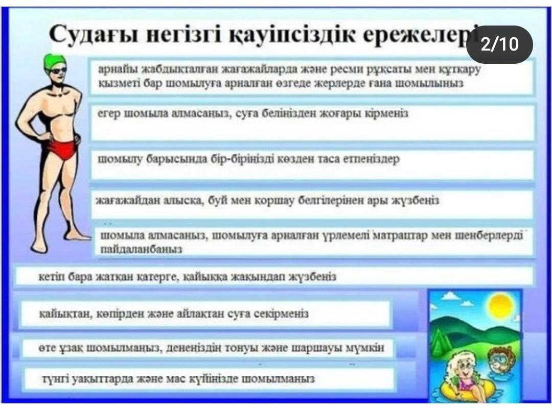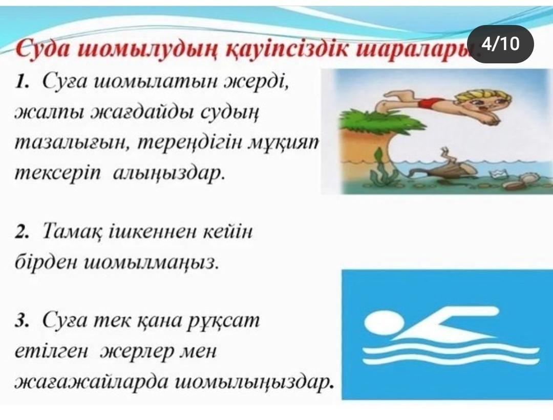 Жазда су айдындарындағы жүріс-тұрыс қағидаларын түсіндіру мақсатында #188 мектеп-гимназиясында жазғы уақытта су қоймаларында өзін-өзі ұстау ережелері бойынша сынып жетекшілер түсіндірме жұмыстарын жүргізіп, бейнероликтер көрсетіп, қазақ тілі және әдебиеті пәнінің мұғалімдері диктант жазғызды.