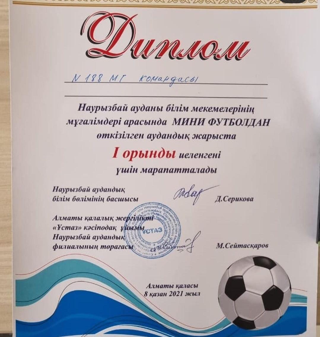 Алматы қалалық жергілікті "Ұстаз" кәсіподақ ұйымы Наурызбай аудандық филиалының ұйымдастыруымен Наурызбай ауданы білім мекемелерінің арасында МИНИ ФУТБОЛДАН өткізілген аудандық жарыста 1 орынды 188 мектеп - гимназиясының ұстаздарынан құралған команда иеленді. Құттықтаймыз!