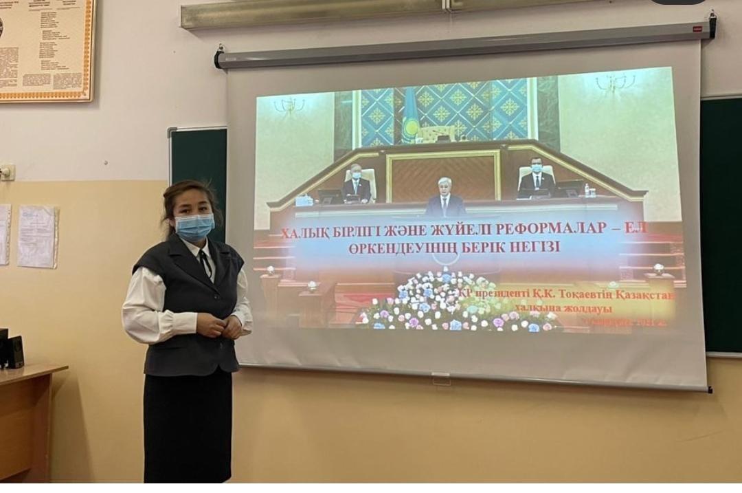 9 қараша күні 9 Б сыныбында "Жастар және заман" тақырыбында Мемлекет Басшысы Қасым-Жомарт Тоқаевтың 1 қыркүйекте Қазақстан халқына "Халық бірлігі және жүйелі реформалар – ел өркендеуінің берік негізі" атты жыл сайынғы Жолдауы талданды. Ол келесі мәселелерге арналған:9 қараша күні 9 Б сыныбында "Жастар және заман" тақырыбында Мемлекет Басшысы Қасым-Жомарт Тоқаевтың 1 қыркүйекте Қазақстан халқына "Халық бірлігі және жүйелі реформалар – ел өркендеуінің берік негізі" атты жыл сайынғы Жолдауы талданды. Ол келесі мәселелерге арналған:Сапалы білім беру;
