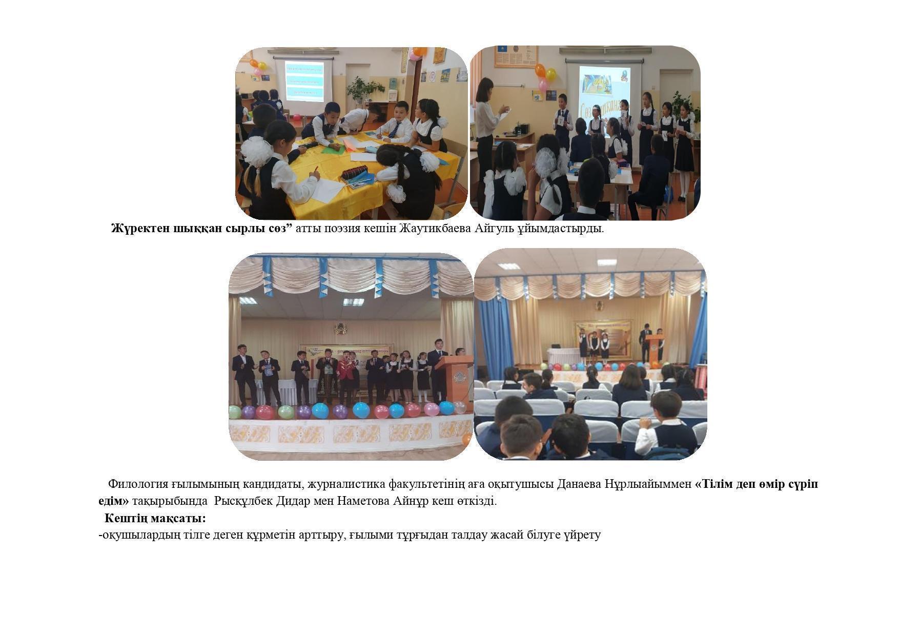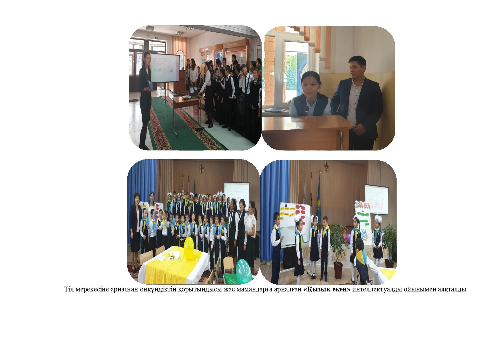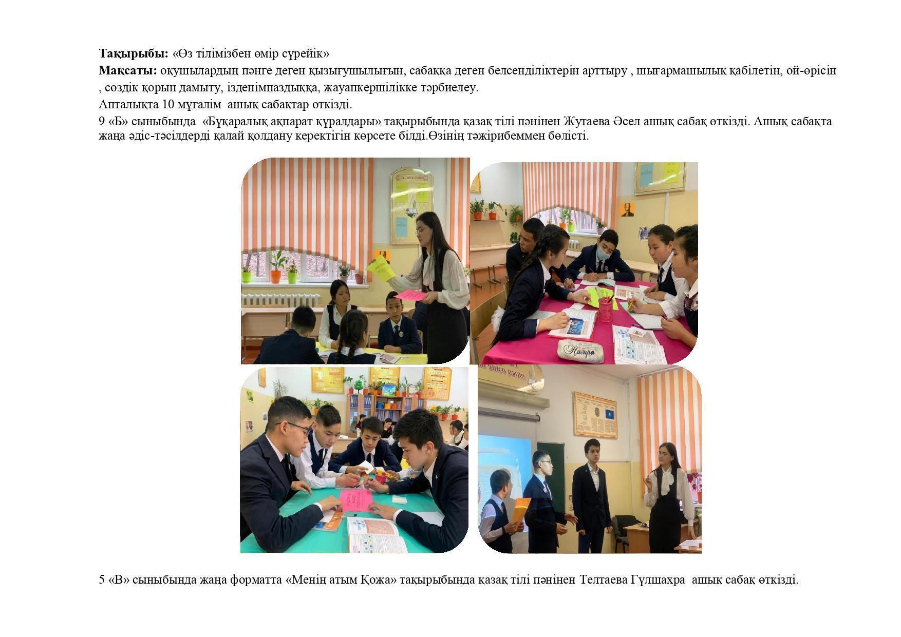 ӘБ мұғалімдері «Жаңа технологияларды қолдана отырып, қазақ тілі сабақтарында жеке тұлғалық-хабардарлық оқыту – бала тұлғасын өзіндік дамыту құралы» тақырыбы бойынша жұмыс істейді. Оқу жылының басында жылдық жоспары жасалды. Әр мұғалімнің өзіндік проблемалық тақырыптар бар. Жыл бойы осы тақырыптар бойынша жұмыс жүргізіп, ӘБ отырысында мұғалімдер баяндама жасайды.