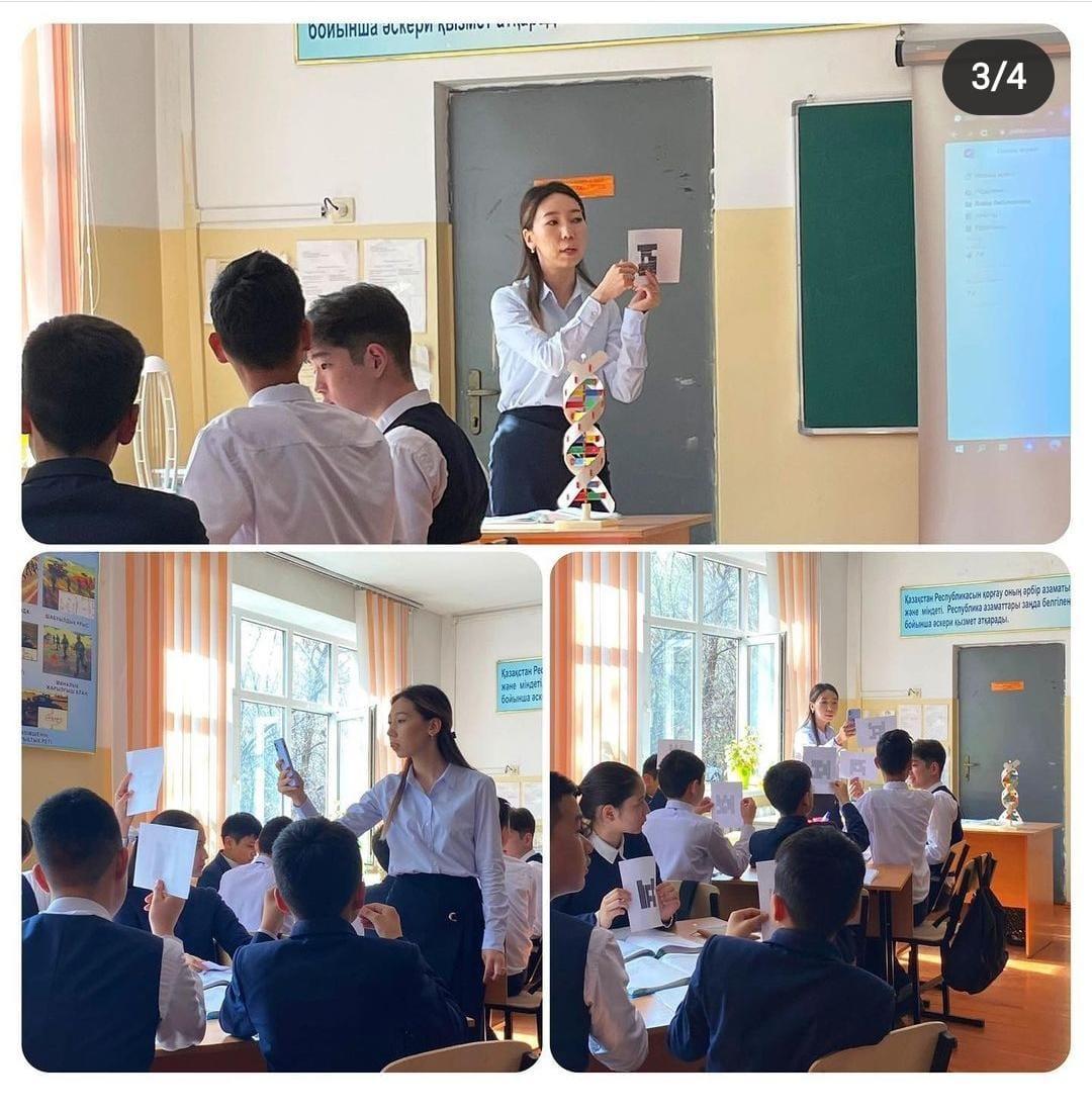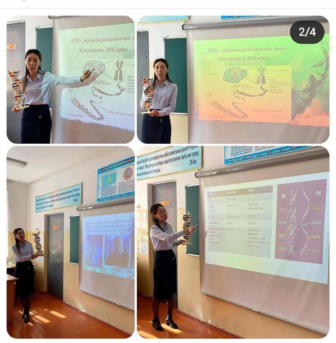 Жас мамандардың "Жаскелсе,іске" апталығы аясында 07.04.2022ж 7 "А" сыныбында "Белгілердің тұқымқуалаудағы ДНҚ-ның рөлі" тақырыбында ашық сабақ өтікізілді.