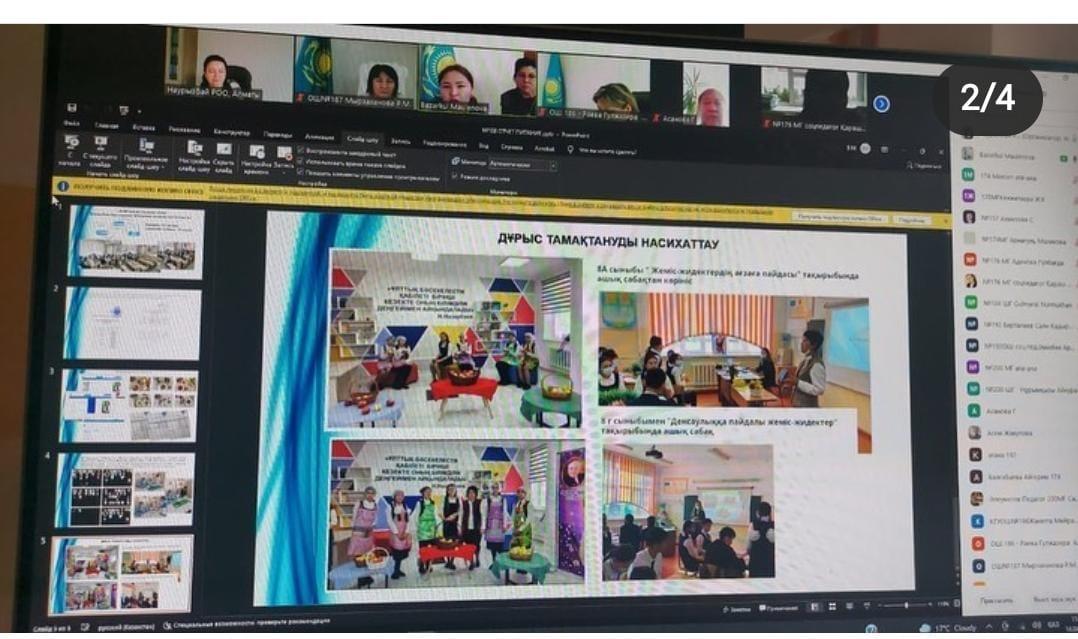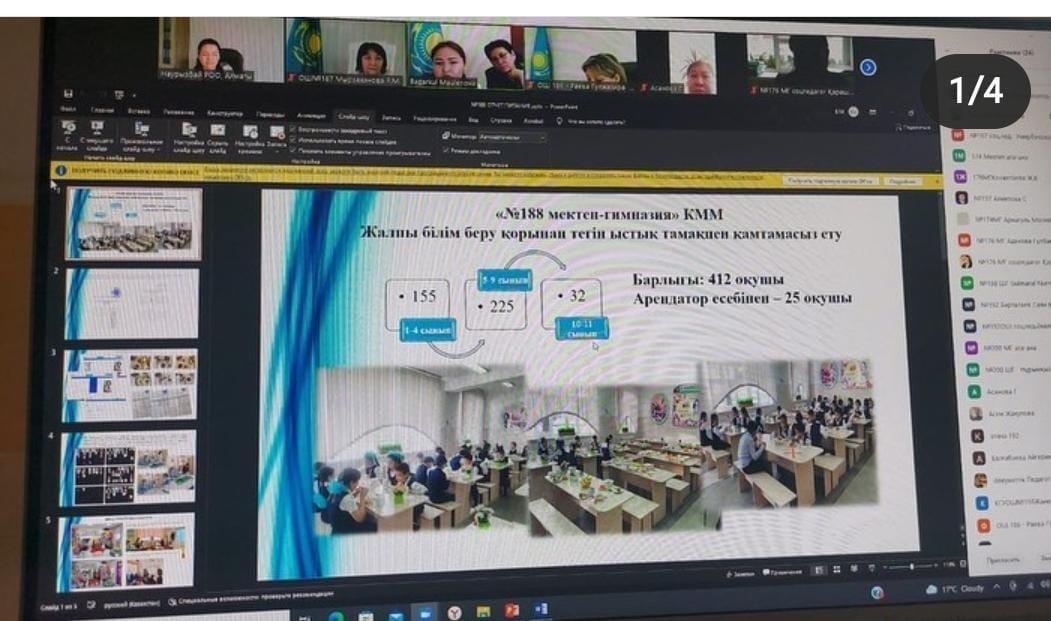 📝14 сәуір күні Алматы қаласы Наурызбай ауданы бойынша #188 мектеп-гимназия оқушыларын сапалы теңдестірілген тамақтанумен қамтамасыз етудің 2021-2023 жылдарға арналған "Жол картасын" іске асыру жөніндегі іс-шаралар жоспарына сәйкес Zoom платформасы арқылы өткен семинарда «Жалпыға білім беру қорынан тегін ыстық тамақтың ұйымдастырылуы» тақырыбында есеп берді және аудандық білім бөлімінің басшысы Серикова Д.С түсіндірме жұмыстарын жүргізді Семинар қорытындыланып, өзекті сұрақтарға жауап берілді