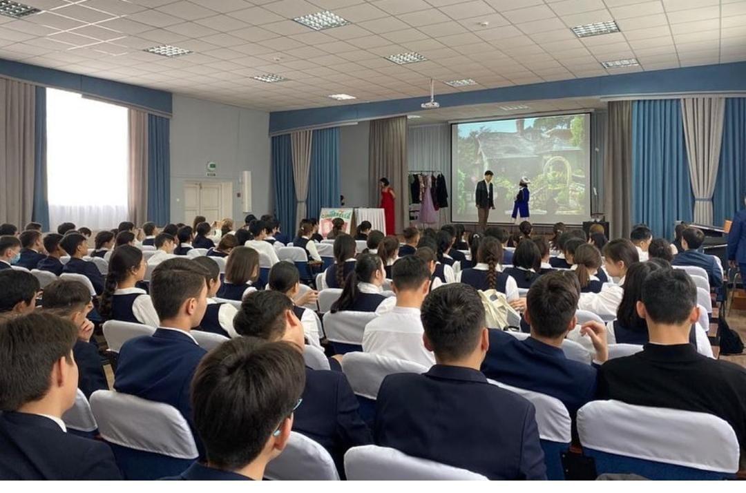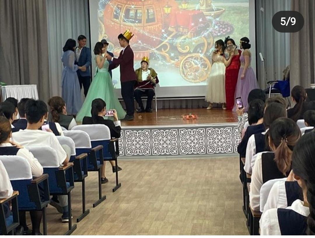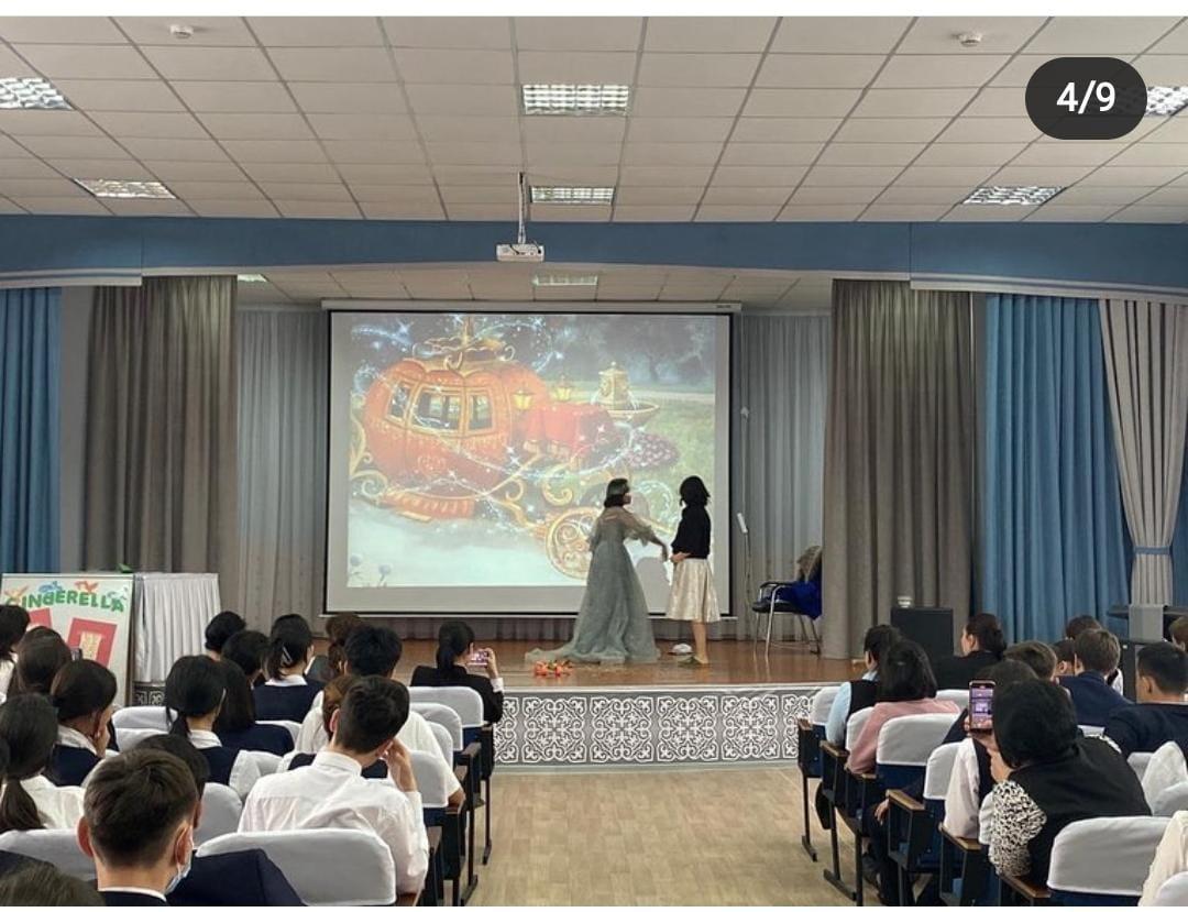 Under the guidance of an English teacher, Mereke, and her trainee Ayaulym, the 9th grade students performed a theatrical performance called 'Cinderella'.