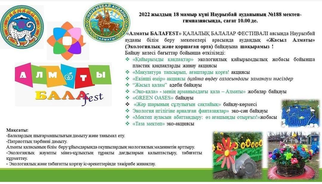 «Алматы БалаFEST» ҚАЛАЛЫҚ БАЛАЛАР ФЕСТИВАЛІ АЯСЫНДА Наурызбай ауданы білім беру мекемелері арасында аудандық «Жасыл Алматы» Экологиялық және қоршаған орта байқауына шақырамыз!