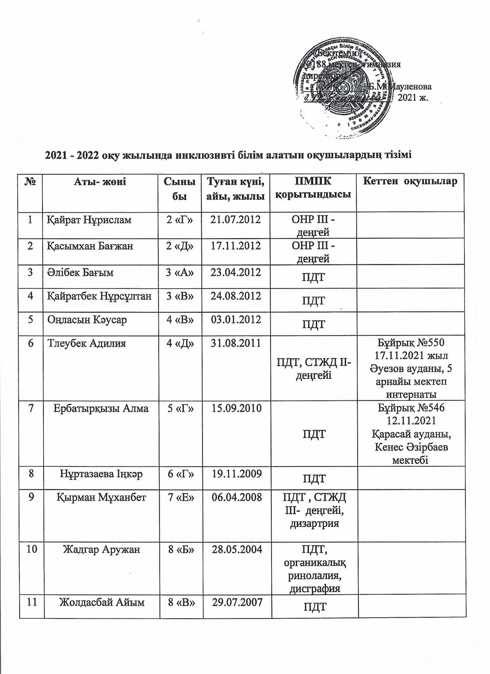 » » » 2021-2022 оқу жылында инклюзивті білім алатын оқушылардың тізімі