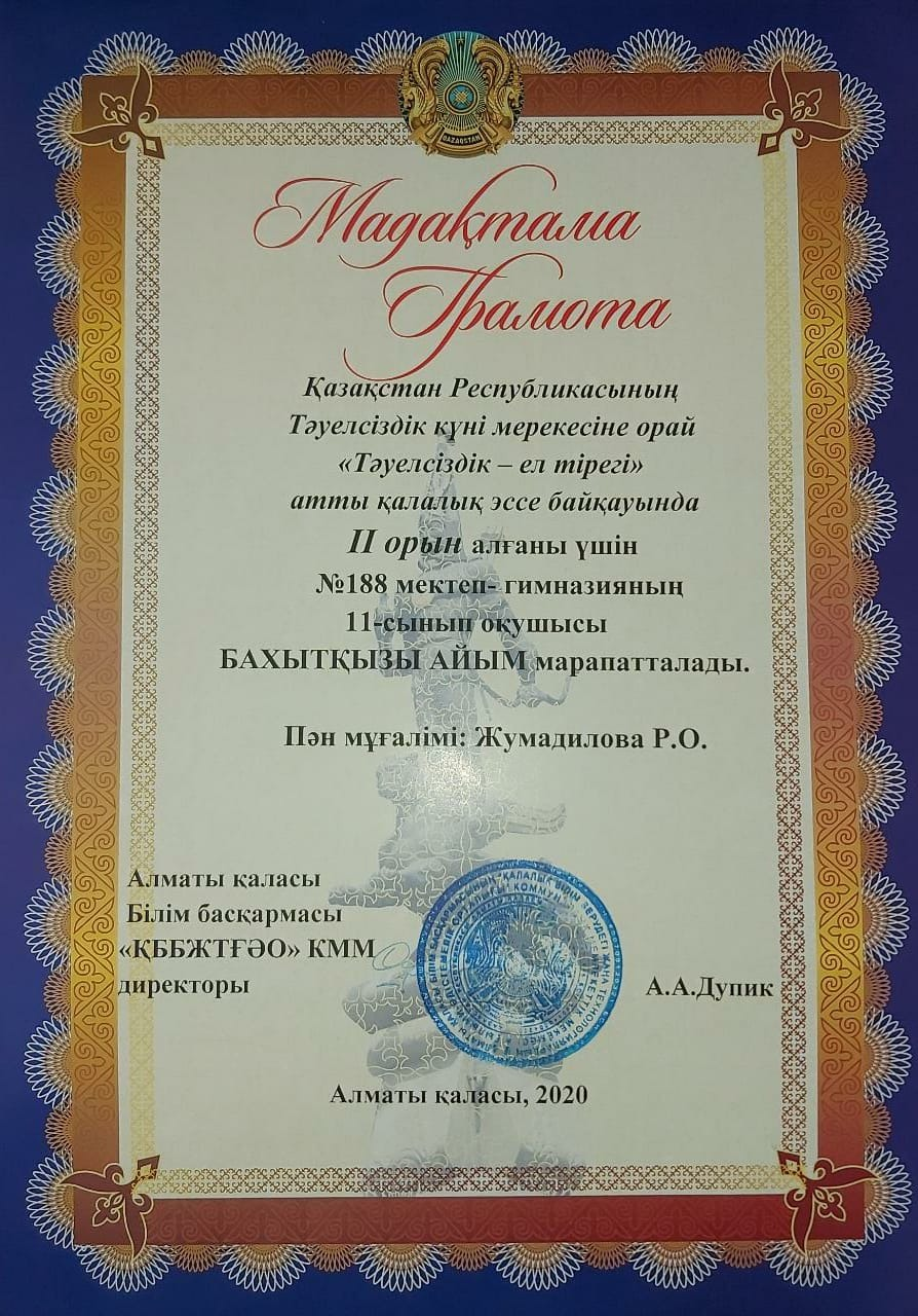 Қазақстан Республикасының Тәуелсіздік күні мерекесіне орай «Тәуелсіздік-ел тірегі» атты қалалық эссе байқауында ІІ орын алғаны үшін №188 мектеп-гимназиясының 11 сынып оқушысы Бақытқызы Айым марапатталды. Пән мұғалімі: Жумадилова Раушан Оралбекқызы