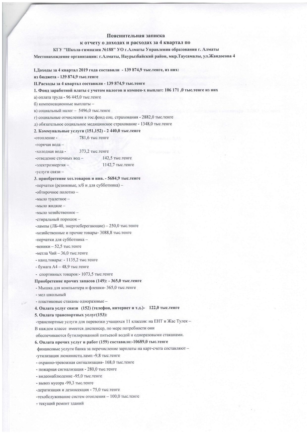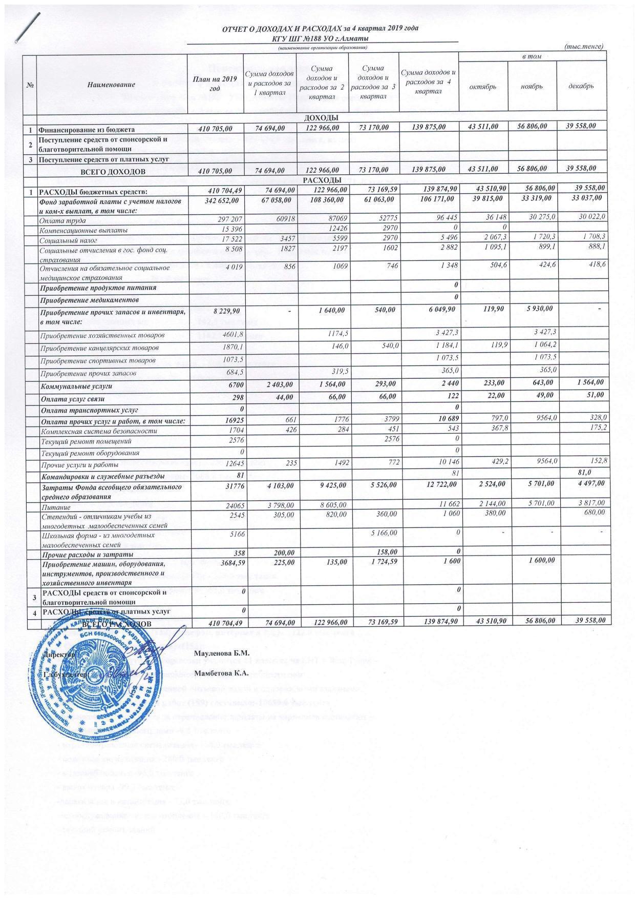 Отчет о доход и расход 4кв-2019г