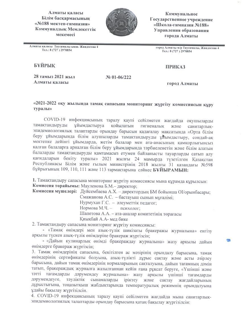 » » 2021-2022 оқу жылында тамақ сапасына мониторинг жүргізу комиссиясын құру туралы