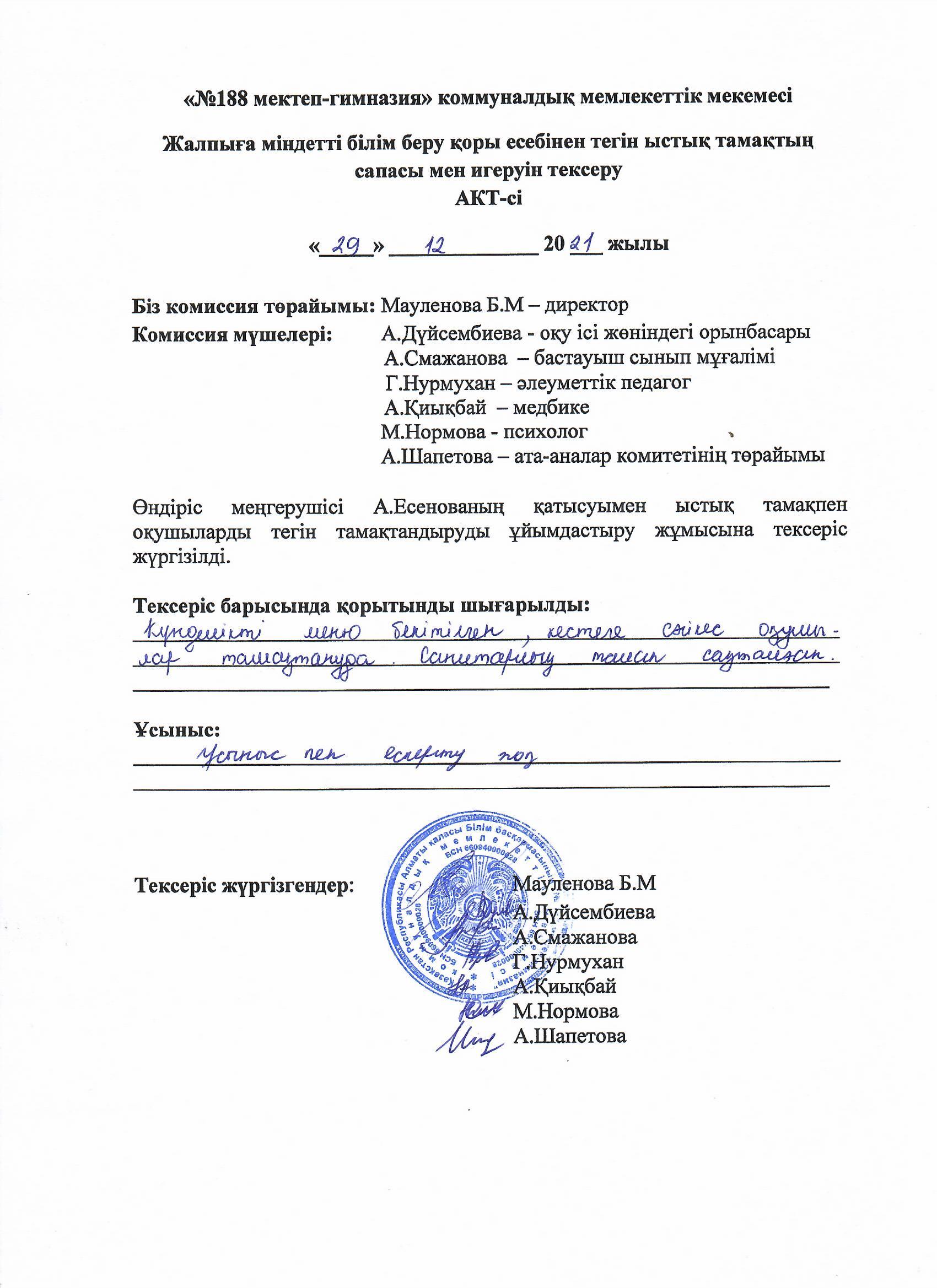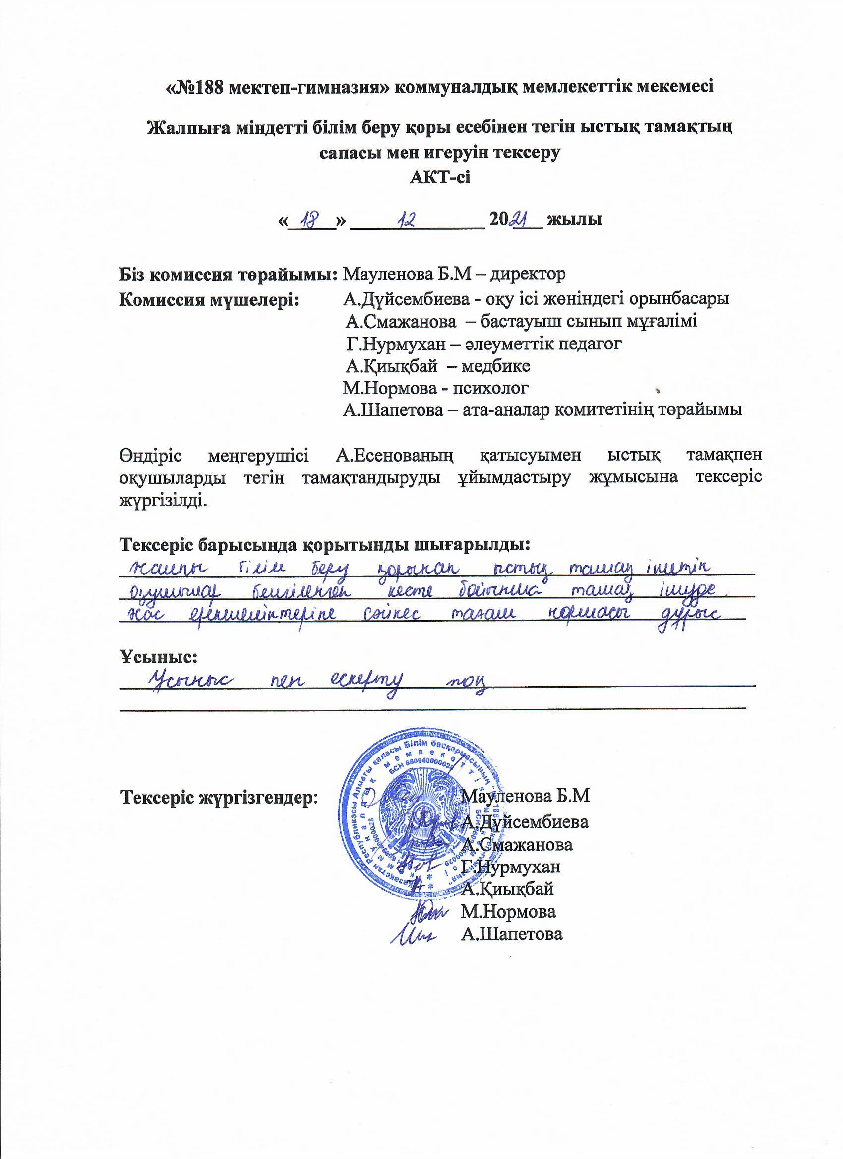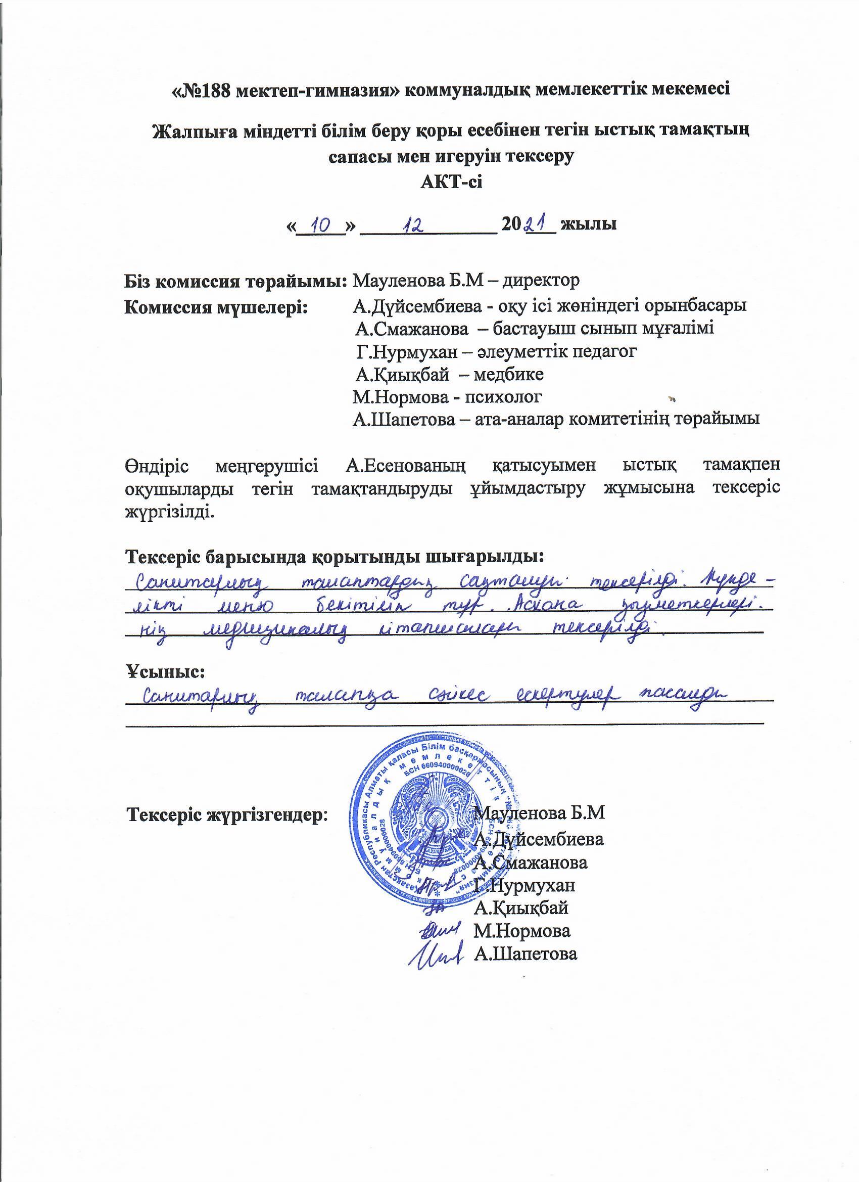 » » Тамақтың сапасы мен игерілуін тексеру АКТ-сі желтоқсан айы 2021