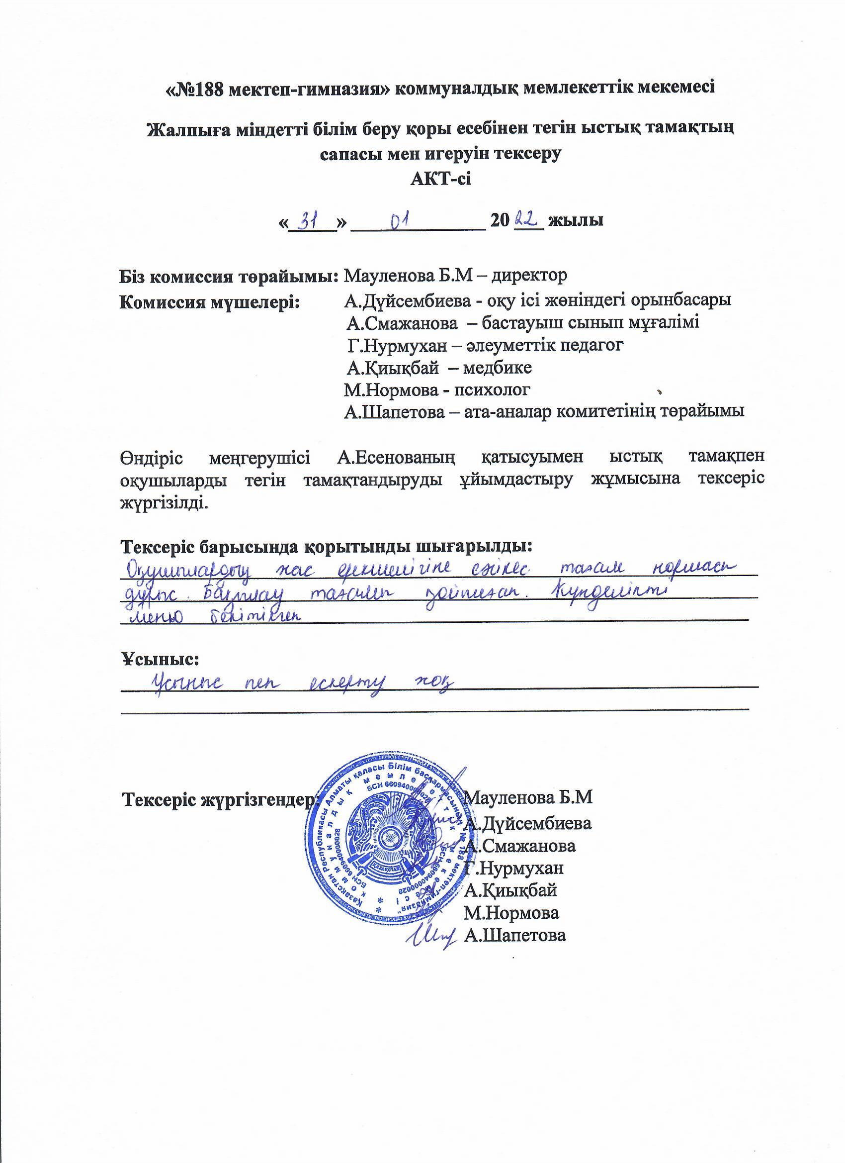 » » Тегін ыстық тамақтың сапасы мен игеруін тексеру АКТ-і қаңтар айы 2022