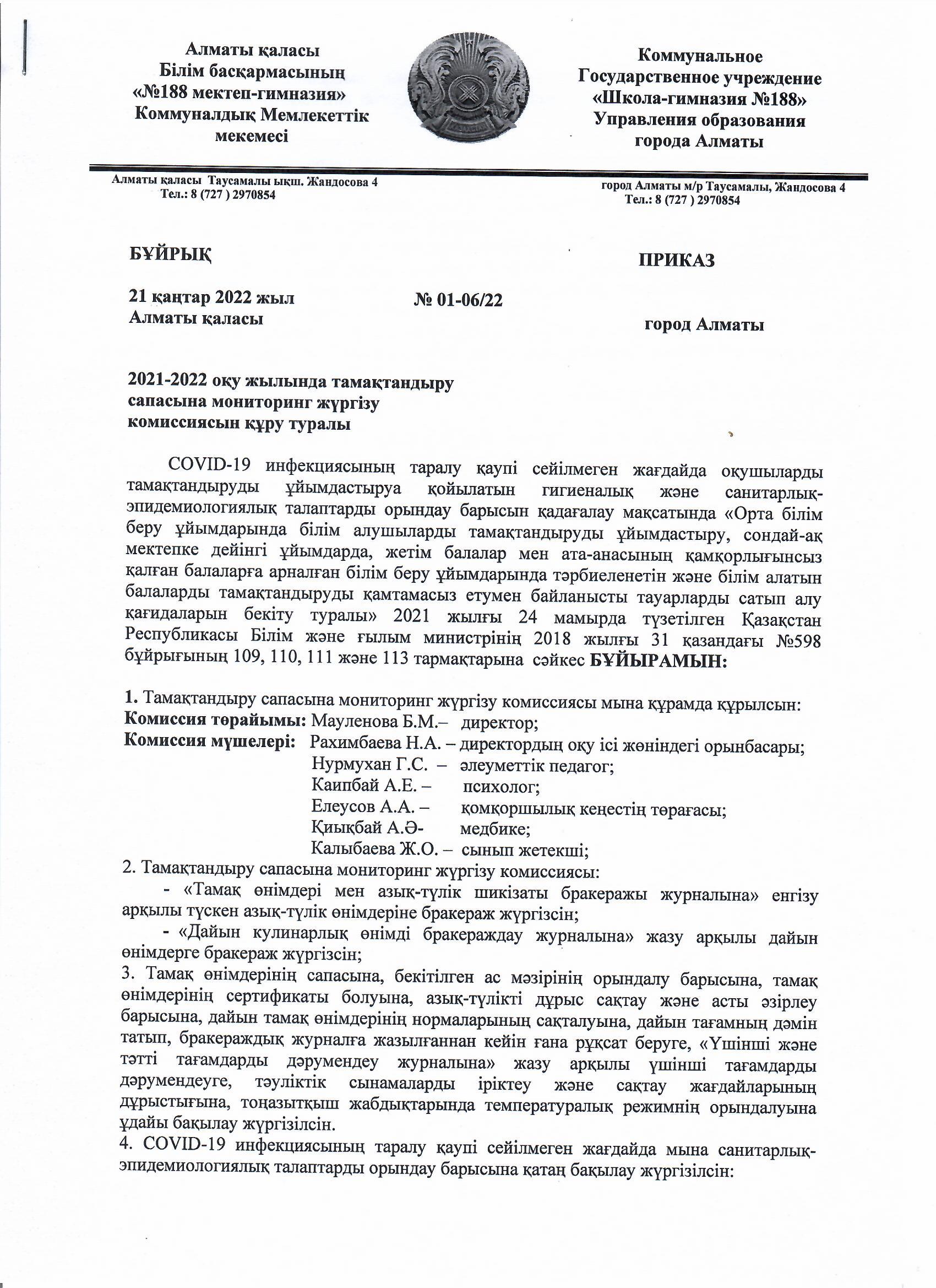 » » » 2021-2022 оқу жылы Тамақтану сапасына мониторинг жүргізу комиссиясын құру туралы