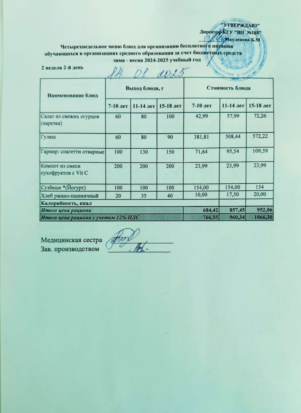 Күнделікті меню 14.01.2025