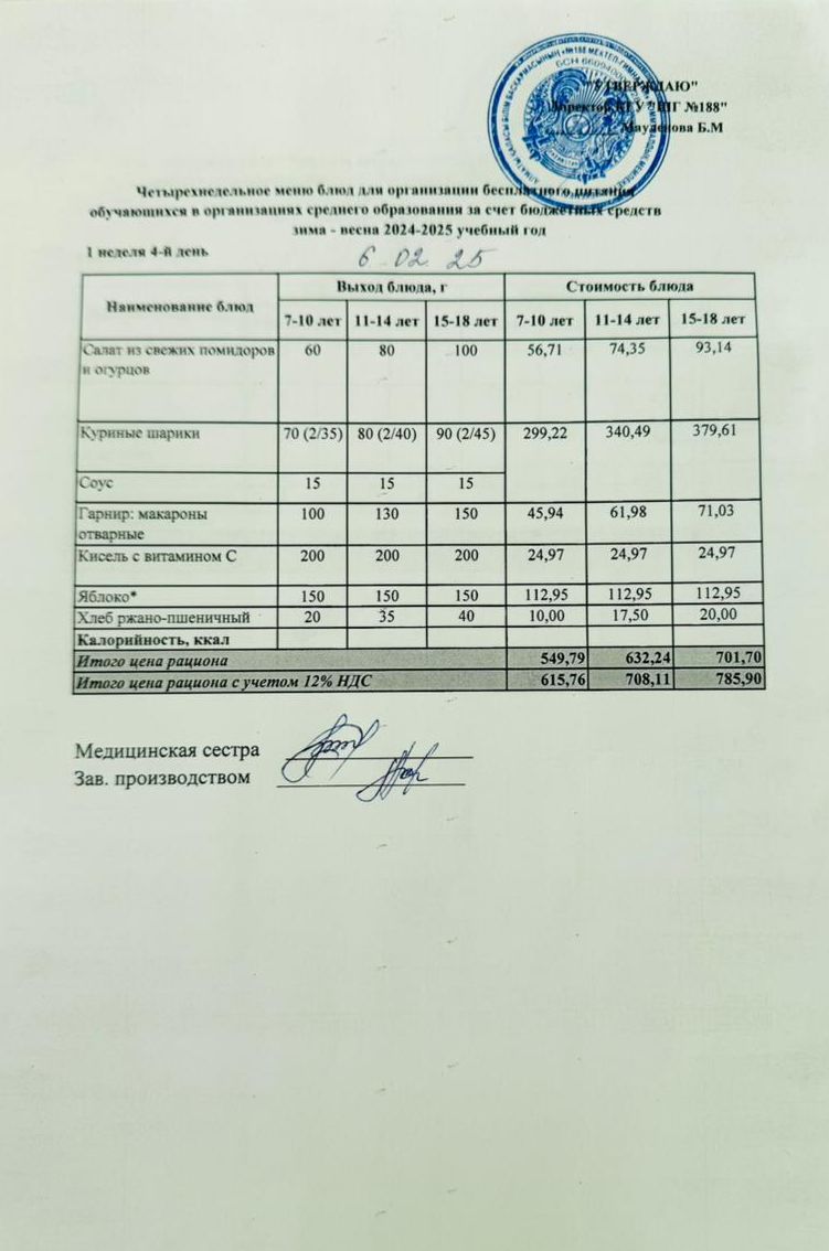 Күнделікті меню 06.02.2025